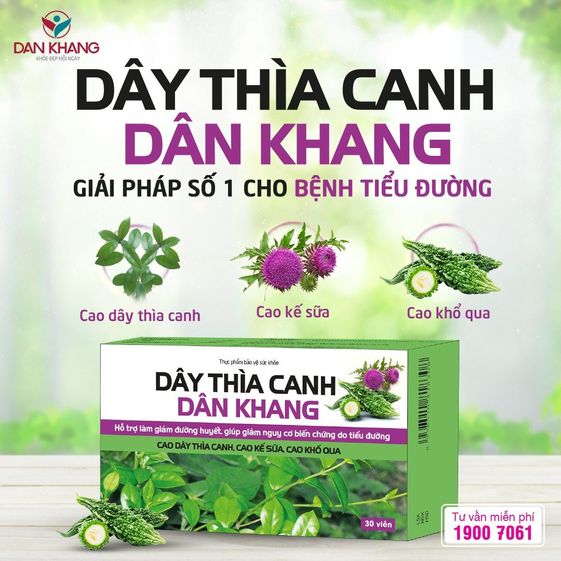 Sản phẩm dây thìa canh Dân Khang với các thành phần chính như: cao dây thìa canh, cao khổ qua, cao Kế sữa. Hỗ trợ làm giảm đường huyết, giúp giảm nguy cơ biến chứng do tiểu đường.
