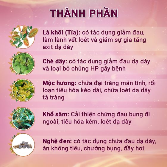 Đối tượng sử dụng: Người bị viêm loét dạ dày, tá tràng với biểu hiện: đau bụng, khó tiêu, ợ hơi, ợ chua, đầy bụng, chướng hơi, đau thượng vị. Người uống thuốc hoặc rượu bia gây hại cho dạ dày.