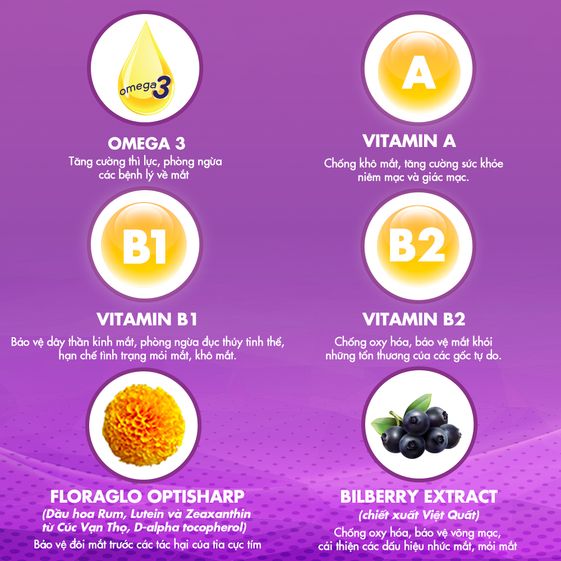 Hỗ trợ tăng cường thị lực, giảm các triệu chứng khô mắt, mỏi mắt, nhìn mờ, hỗ trợ giảm nguy cơ thoái hoá điểm vàng.