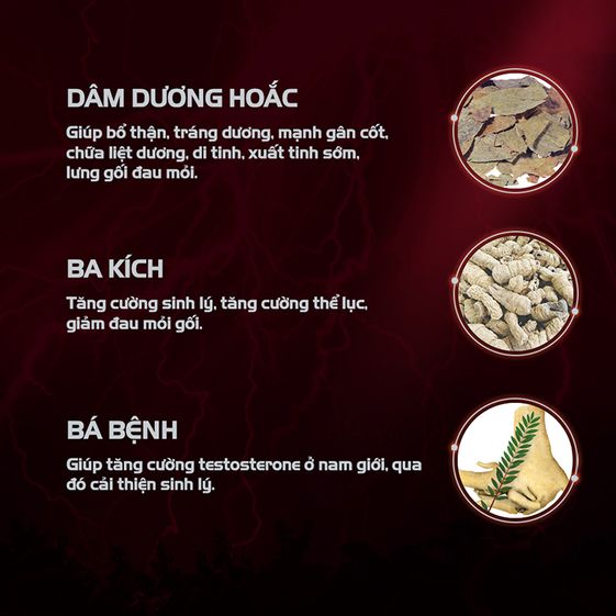 Thành phần: Dâm dương hoắc, ba kích, bá bệnh, bạch tật lê, sâm macca, nấm ngọc cẩu, nhân sâm (panax ginseng), lộc nhung, hòe hoa, hoàng tinh, hoài sơn, câu kỷ tử, Thảo quyết minh, bột thịt Hàu biển khô, L-Arginine HCI