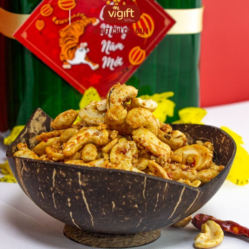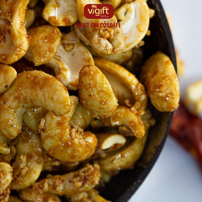 Hạt điều, tỏi ớt ,gia vị. the cay, ngon xuất sắc nhờ lớp tỏi phi hào quyện vị bùi béo của hạt điều chắc chắn sẽ khiến bạn mê đắm ngay khi thưởng thức.