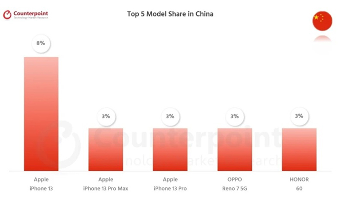 Trong khi đó, tại thị trường smartphone Trung Quốc – hiện đang bị phân mảnh, thị phần của iPhone 13 và iPhone 13 Pro/ iPhone 13 Pro Max chỉ chiếm 8% và 3%.