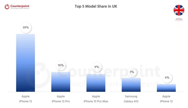 Tại các thị trường Mỹ, Anh, Trung Quốc, dòng iPhone 13 của Apple đều giữ vị trí thống trị.