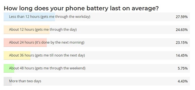 Trang tin công nghệ Phone Arena đã tiến hành một cuộc thăm dò với hàng triệu độc giả, cho kết quả giống nhau. Đa số người dùng sẽ dùng hết pin smartphone trong hơn một ngày. Tình trạng này vẫn không thay đổi sau nhiều năm.
